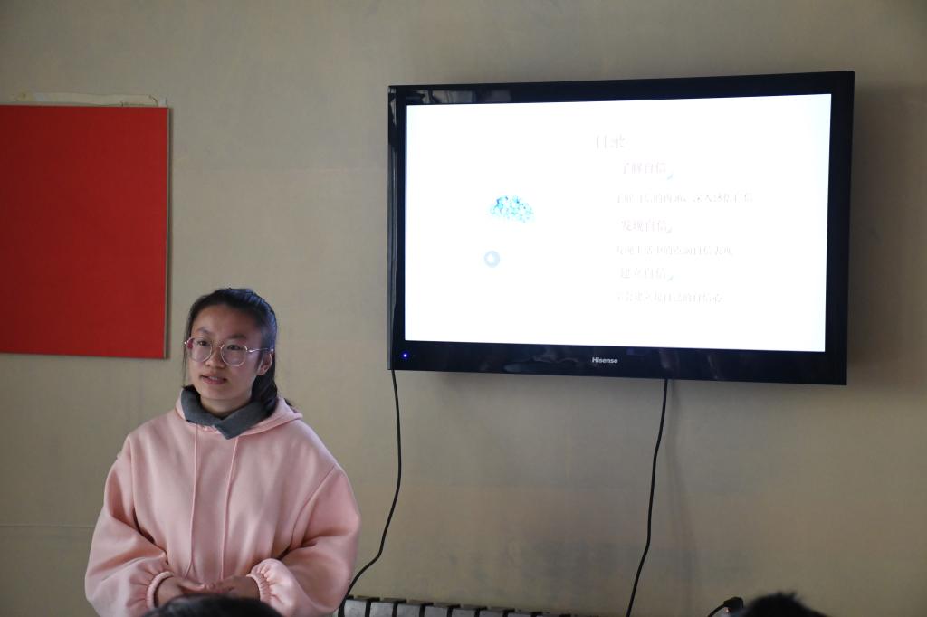 本期“朋辈小讲堂”主讲人为李青青、张佳鑫、梁磊、郭晴晴。四位主讲人围绕“自卑与自信”进行交流分享。首先李青青、张佳鑫从自卑的原因以及克服自卑的方式两个方面进行了详细的阐述。随后,梁磊、郭晴晴对如何树立自信做出讲解并分享自身建立自信心的技巧方法。四位主讲人以生动幽默的语言开展分享,课堂气氛活跃,同学们积极回应,掌声不断。