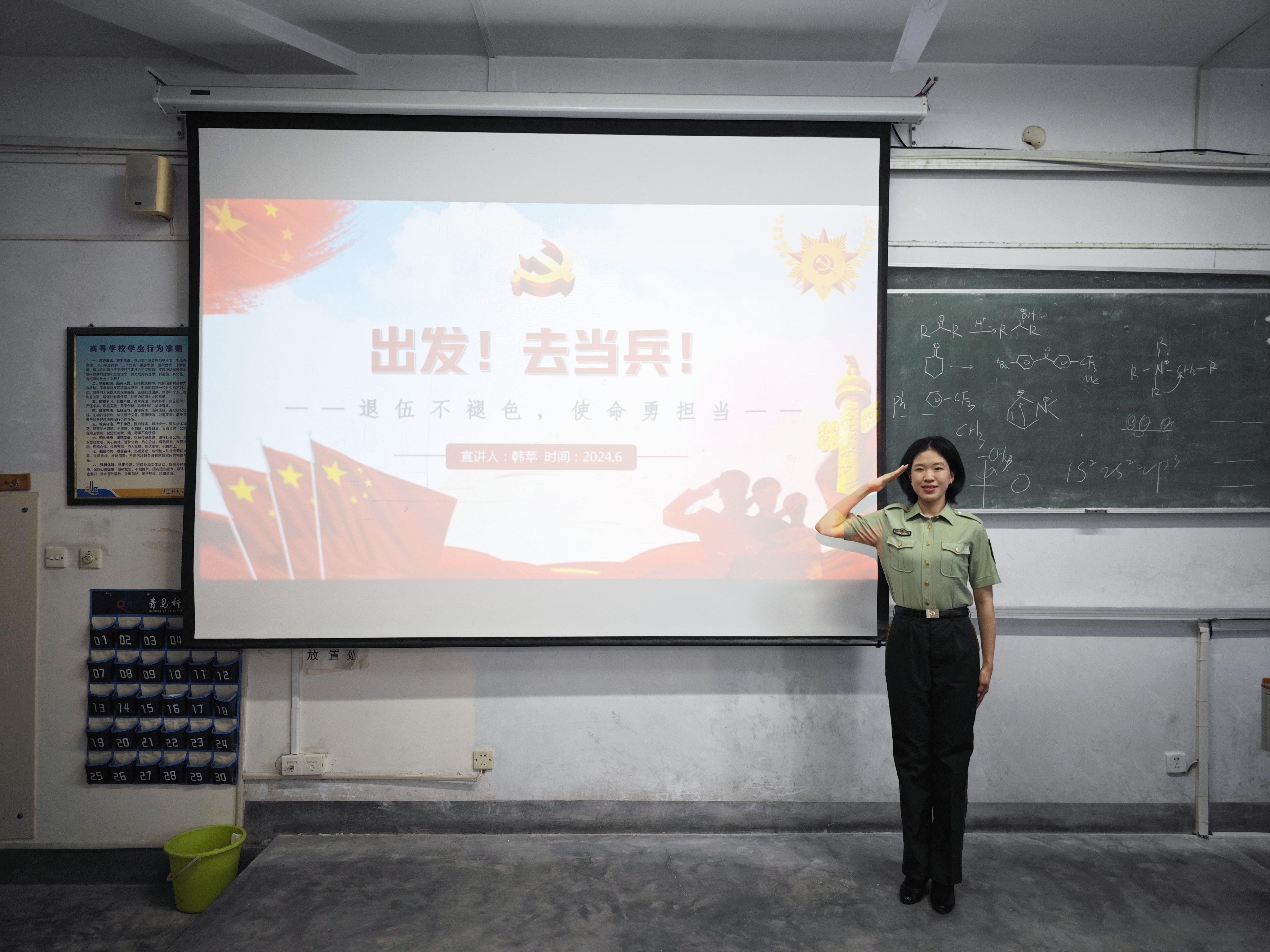 为进一步优化征兵宣传工作,营造浓厚的征兵工作氛围,充分激发同学们踊跃报名参军的热情。6月18日,化工学院创新征兵宣讲模式,结合大学生军事理论课,邀请学校大学生就业引航员、退役大学生士兵制剂231班韩苹同学做军旅生涯分享。
