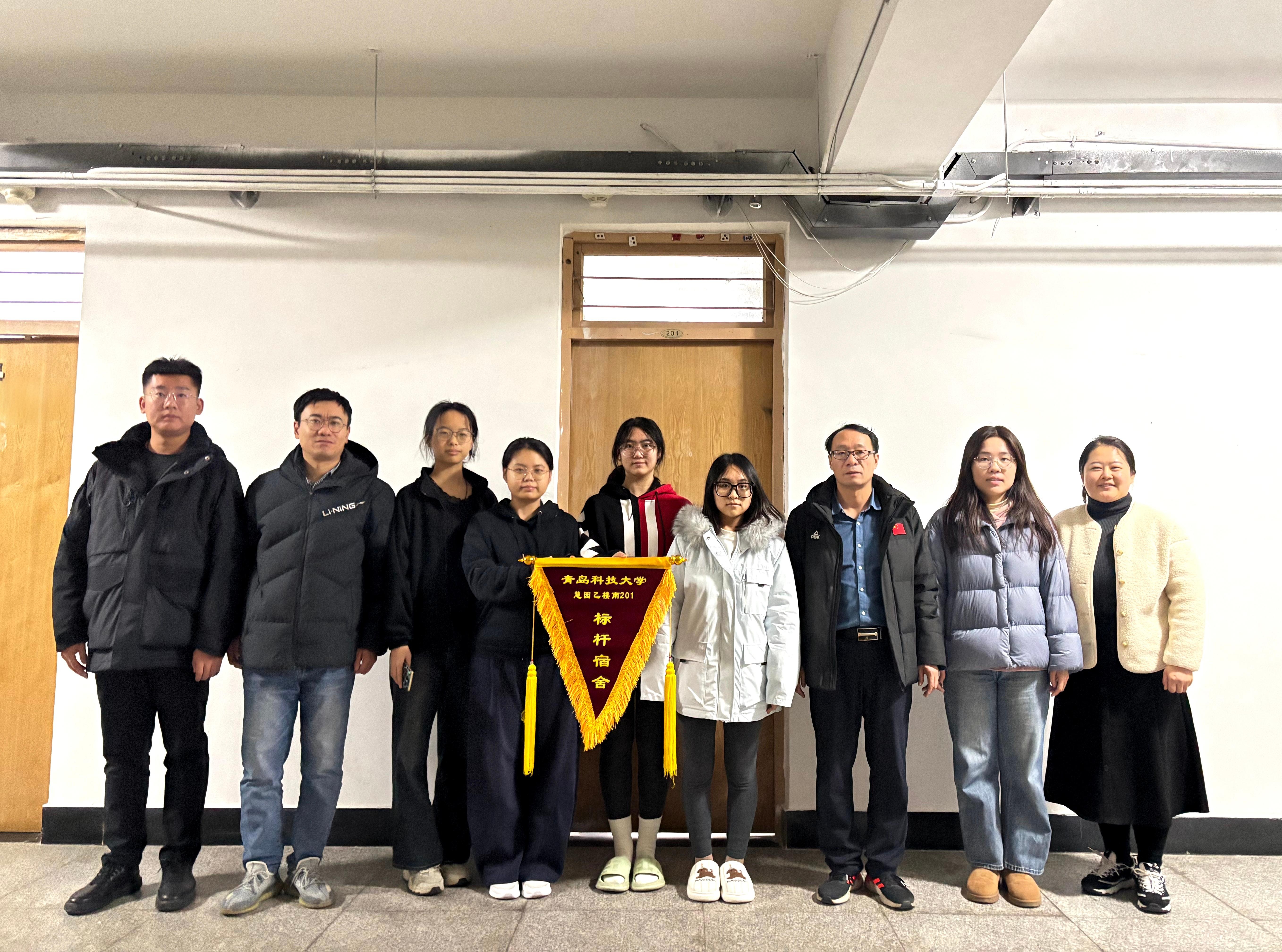 为深入落实学校宿舍管理与服务工作相关要求,表彰先进典型,发挥标杆引领作用,进一步深化学院宿舍育人阵地建设,12月15日下午,雷竞技投注在慧园乙南宿舍楼举行学校“标杆宿舍”锦旗授予悬挂活动。学院党委副书记兼副院长贾建闯、学工办主任兼团委书记杜宗杰,辅导员于文倩、李颖、宋伟国、赵建滕及获评宿舍全体成员参加活动。