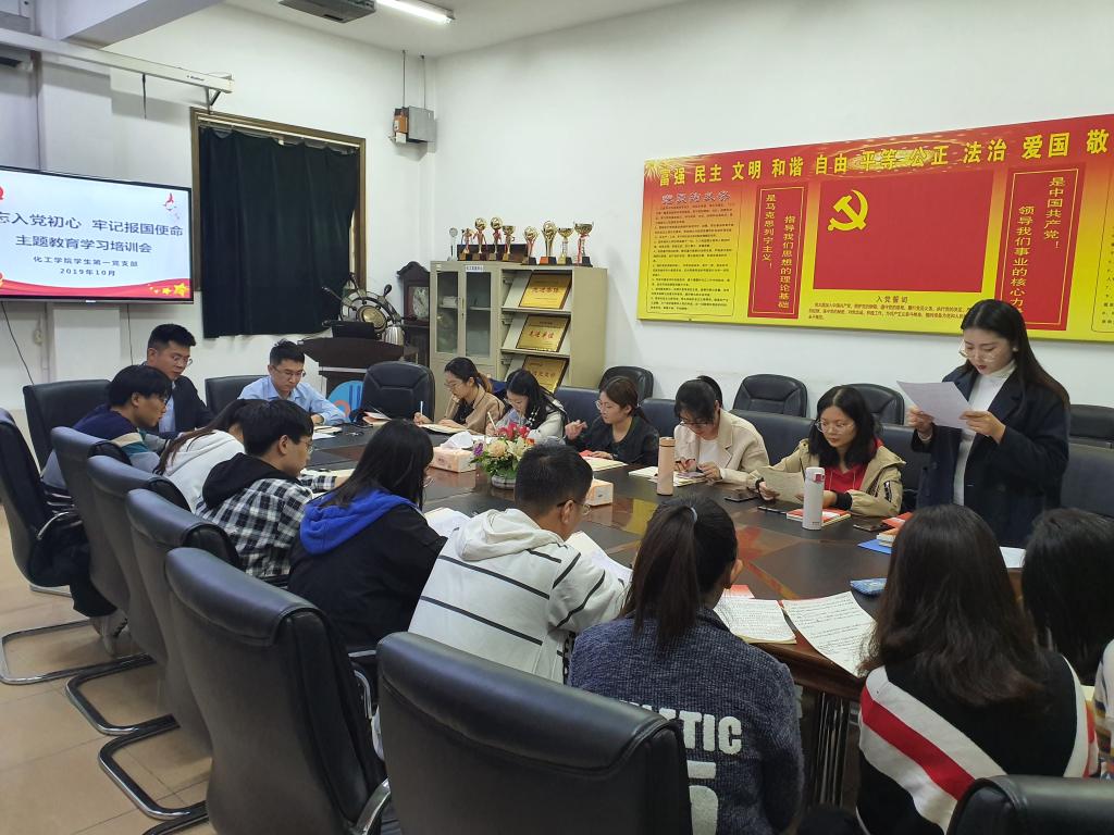10月25日,化工学院学生第一党支部”不忘入党初心,牢记报国使命“主题教育学习会在学院先锋党苑活动室举行。党支部书记耿赛、支部全体党员参加。