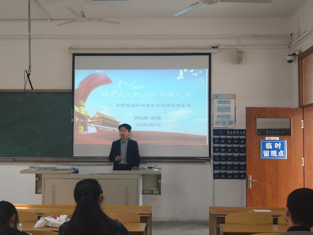 2020年10月27日下午1:00,化工学院研究生第一党支部在第二教学楼218教室召开“扬党建之帆、行科研之舟”主题党日活动。会议由支部副书记邬雅喃主持,全体支部党员参加会议。