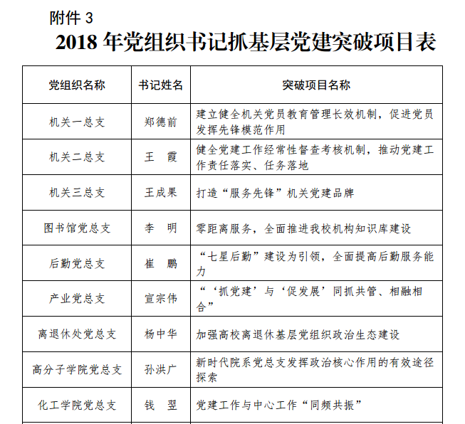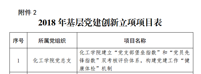 根据《关于开展基层党建创新研究若干工作的通知》要求,根据二级单位党组织申报、学校评审,最终确定批准10个项目为2018年度学校基层党建创新立项项目,批准30个党组织书记抓基层党建突破项目。