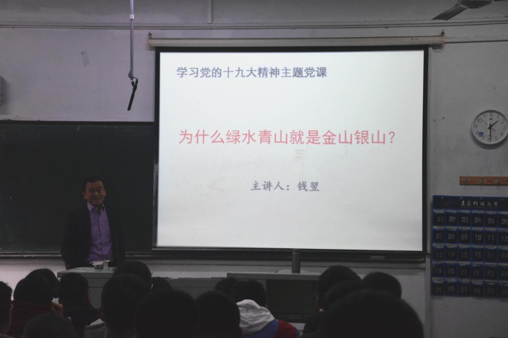 12月18日下午,化工学院党总支书记钱翌在一号教学楼107教室给全体学生党员、入党积极分子上学习党的十九大精神主题党课。本次党课以《为什么绿水青山就是金山银山》为主题,100余学生参加学习。