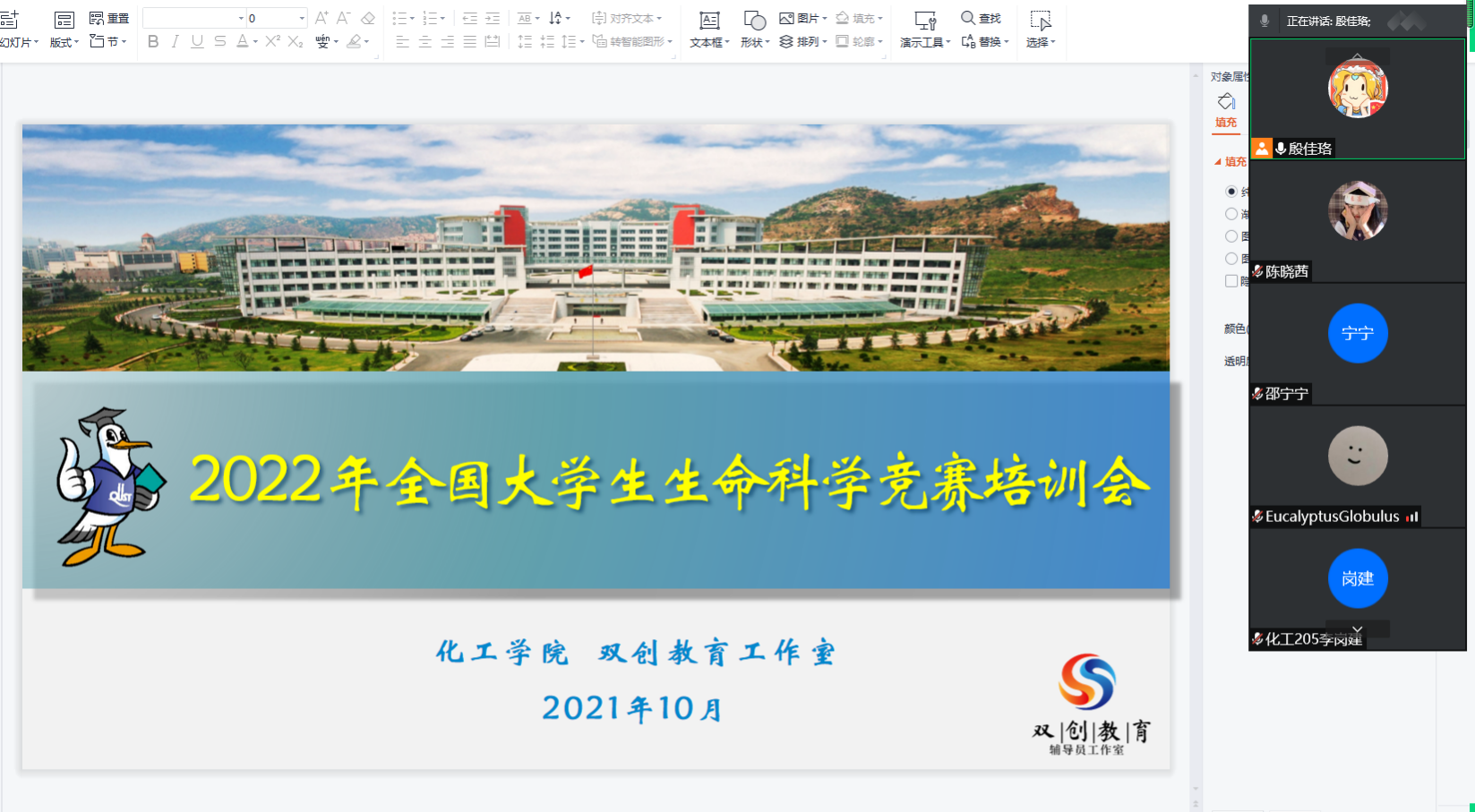 10月29日,化工学院双创教育辅导员工作室通过腾讯会议召开2022年全国大学生生命科学竞赛培训会,化工学院各年级参赛团队共计100余名同学参加,工作室成员殷佳珞主持会议。