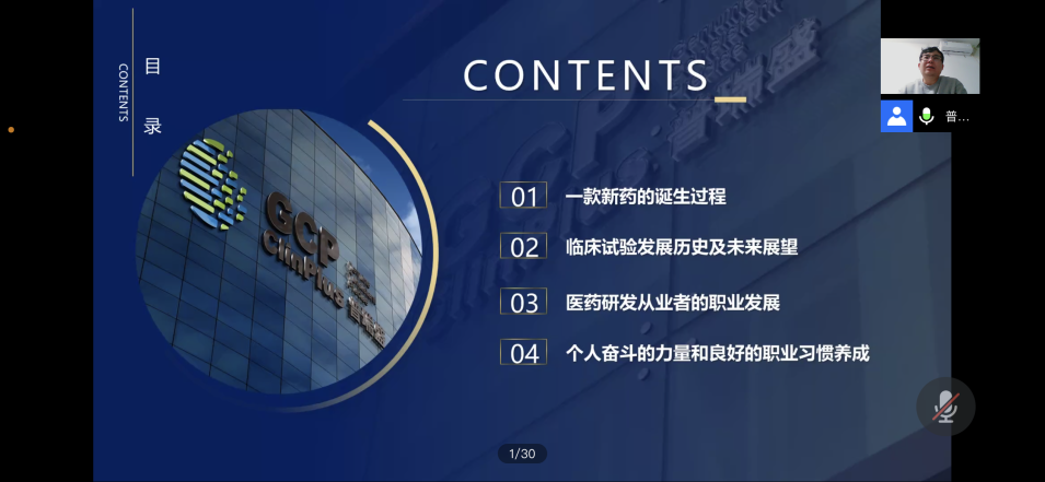 讲座伊始,郝永红结合专业知识,细致入微地讲解了一款新药的诞生过程,引导同学们认识到药物开发是一个长期和复杂的过程。随后郝永红讲述了临床试验的发展历史,通过分析中美科技差距和近几年国内医药行业战略规划,指出我国在医药研发方面有巨大发展空间,行业规模将不断扩大。同时郝永红也介绍了医药研发从业者多样的职业发展空间和岗位用人要求,最后结合个人经历强调个人奋斗的重要性,深入剖析了就业所需的能力,鼓励同学们养成良好的职业习惯,并祝愿同学们就业顺利。