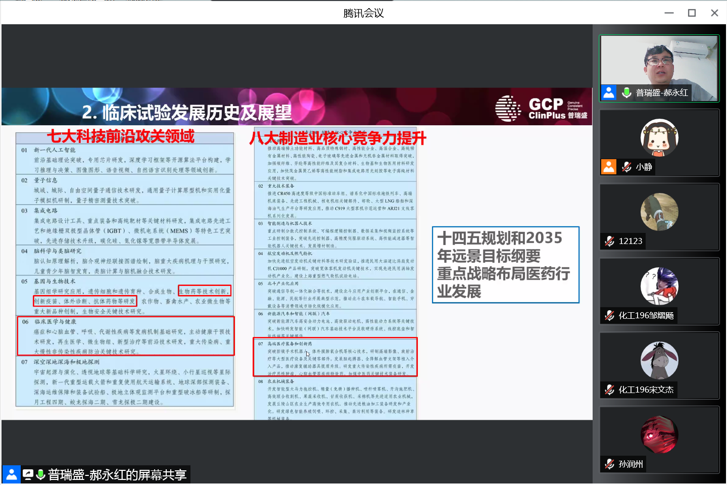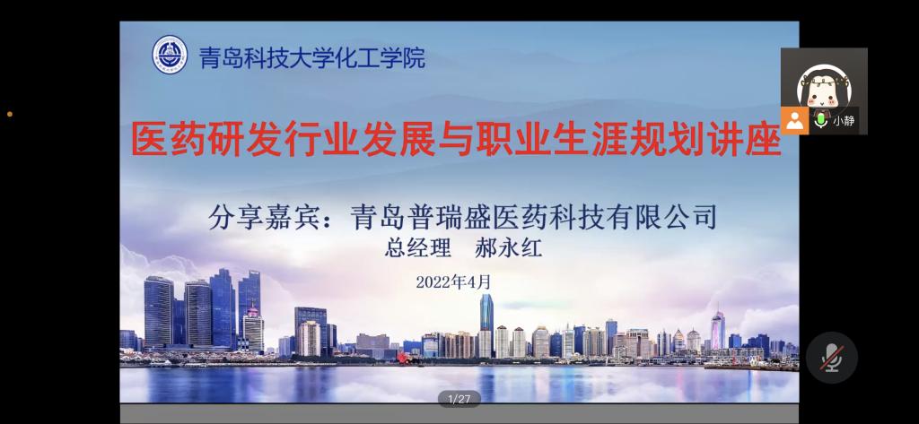 为帮助我院学生树立正确的就业观,提高就业竞争力,更好地适应就业市场需要,为今后步入社会打下基础,4月9日上午,化工学院特邀青岛普瑞盛医药科技有限公司总经理郝永红为学生带来题为《医药研发行业发展与职业生涯规划》的讲座。本次讲座由团委老师付文静主持,化工学院二百余名学生通过腾讯会议平台到会聆听。