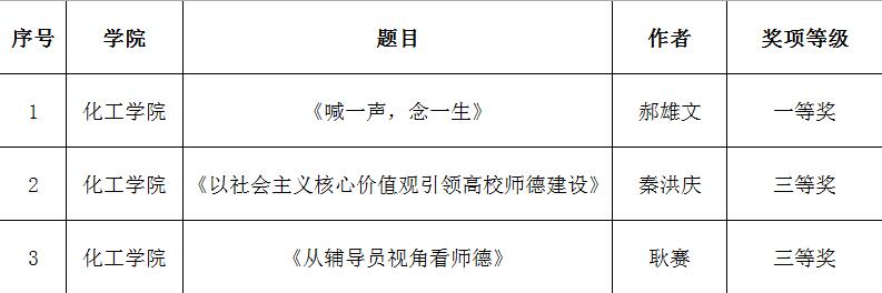 近日,由青岛科技大学工会主办的2018年师德征文比赛获奖名单公示,化工学院报送的作品获3项表彰。其中,由郝雄文撰写的《喊一声,念一生》荣获一等奖,《以社会主义核心价值观引领高校师德建设》、《从辅导员视角看师德》获三等奖。