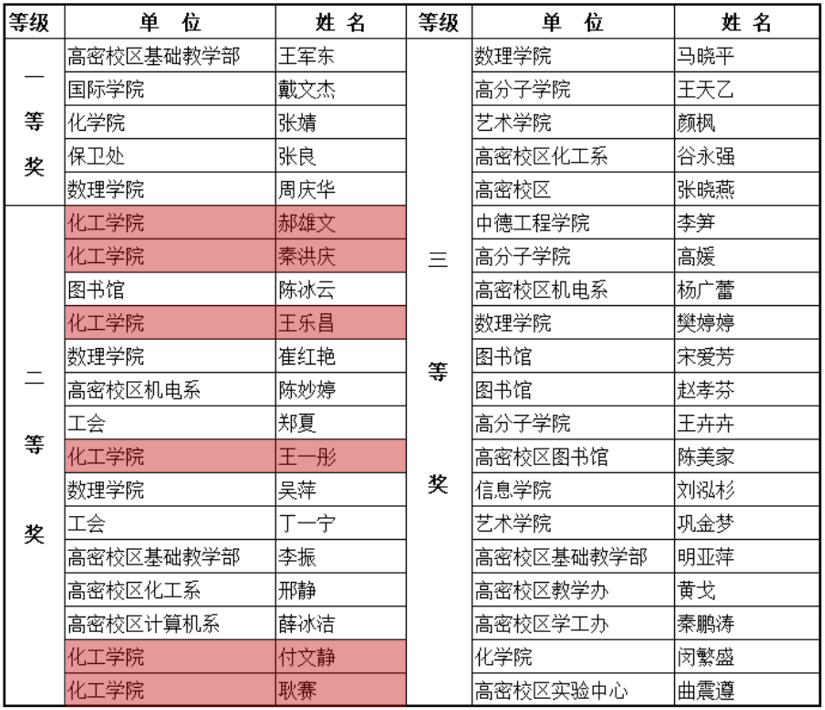 1月7日,由校工会主办的青岛科技大学2019年教职工师德征文比赛获奖名单公示,化工学院秦洪庆、耿赛、王乐昌、郝雄文、付文静、王一彤获二等奖。