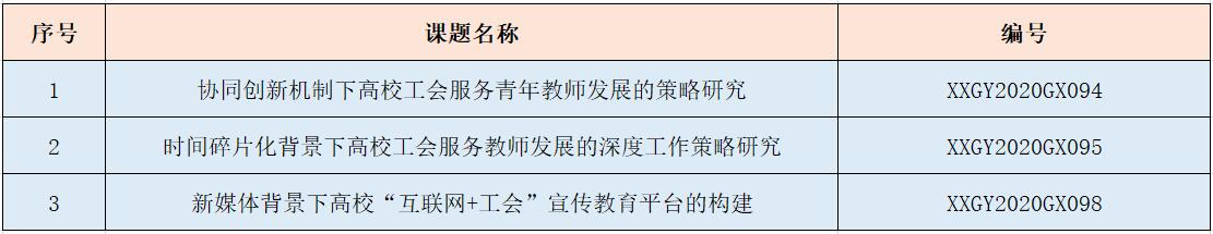 7月1日,中国教育工会山东省委员会、山东省学校工运研究会发布《关于公布2020年全省教育系统工会理论研究和调查研究立项课题的通知》,由化工学院工会组织申报、学校工会推荐,秦洪庆主持的课题《协同创新机制下高校工会服务青年教师发展的策略研究》(课题编号:XXGY2020GX094)、刘彬的课题《时间碎片化背景下高校工会服务教师发展的深度工作策略研》(课题编号:XXGY2020GX095)、付文静的课题《新媒体背景下高校“互联网+工会”宣传教育平台的构》(课题编号:XXGY2020GX098)成功获批立项项目。