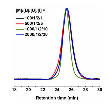 图3.不同催化剂浓度下PδCL的GPC曲线