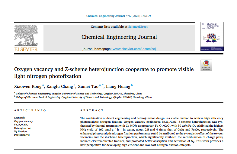 化工学院陶旭梅教授团队采用氧空位和Z型异质结共同促进可见光催化固氮性能,在光催化固氮领域取得新进展。相关成果以“Oxygen vacancy and Z-scheme heterojunction cooperate to promote visible light nitrogen photofixation”为题发表在国际知名期刊《Chemical Engineering Journal》(影响因子15.1,中科院1区)。论文第一作者为2021级硕士孔晓文,通讯作者陶旭梅教授,青岛科技大学为第一单位和唯一通讯单位。论文DOI链接为https://doi.org/10.1016/j.cej.2023.146159