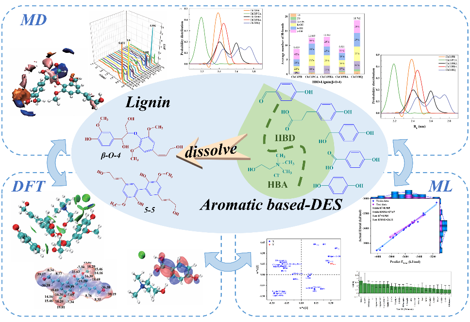 团队采用密度泛函计算、分子动力学模拟和多变量分析等方法,研究了5种芳香基DES与2种木质素二聚体模型的相互作用机理。探讨了溶解温度和芳香氢键给体类型对木质素β-O-4与5-5亚结构单元间连接键或与不同官能团相互作用的影响。在木质素溶解过程中,γ-OH是PB和Cl-作用于木质素二聚体(β-O-4)的首选位点,与γ-OH形成氢键的比例为40%。它分布在木质素二聚体(β-O-4)周围0.28 ~ 0.32 nm处,总相互作用能为-4041.1452 kJ/mol。相关研究成果以“Comprehensive analysis of lignin dimer dissolution microscopic mechanism in different aromatic-based deep eutectic solvent”为题目,发表在生物质化工研究领域国际知名期刊Industrial Crops & Products(SCI一区TOP期刊)。论文第一作者为化工学院2021级硕士研究生朱宝平和2022级硕士研究生葛瀚文,通讯作者为徐环斐,青岛科技大学为第一单位和唯一通讯单位。论文DOI链接为10.1016/j.indcrop.2024.119736。