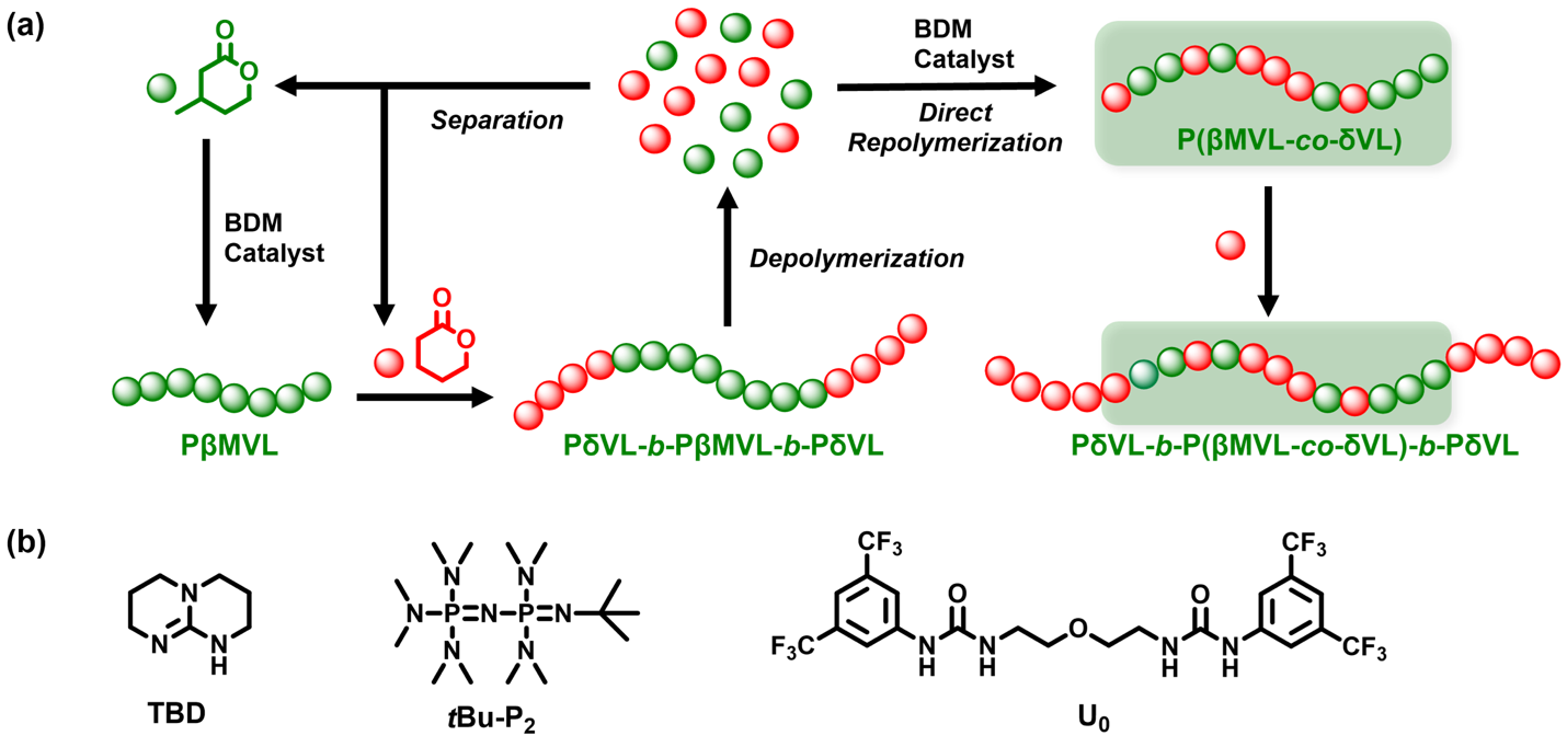 针对这一问题,化工学院沈勇/李志波团队提出了一种新型高韧性可闭环回收TPEs,该材料可以通过生物基β-甲基-δ-戊内酯(βMVL)和δ-戊内酯(δVL)的顺序开环共聚(Ring-Opening Copolymerization, ROP)方法制备,能够在保持优异韧性的同时,实现高效闭环回收。相关研究成果以“Tough and Closed-loop Recyclable Thermoplastic Elastomers from Sequential Ring-Opening Copolymerization of Bio-renewable β-Methyl-δ-Valerolactone and δ-Valerolactone”为题发表在《Advanced Functional Materials》上。