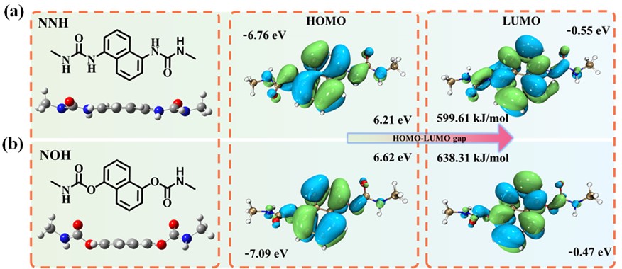 本研究同时探究了分子结构对其机械性能及荧光性能的影响。荧光强度的影响因素不仅与氢键的存在有关,还与萘环周围的结构密切相关。使用Gaussian软件对含有不同取代基的萘环结构进行优化,取代基分别为氨基甲酸酯(NOH)和氨基脲基(NNH)。随后,利用Multiwfn计算了前沿轨道能量和电子密度分布,优化后的球棒模型清晰地显示,NNH萘环周围的结构平面度优于NOH。通过前沿轨道图可以看出,NNH的HOMO轨道能量(-6.67 eV)高于NOH(-7.09 eV),而NNH的LUMO轨道能量(-0.55 eV)则低于NOH(-0.47 eV),这表明NNH具有较小的能隙,更容易激发。NNH较小的能隙以及其优越的平面刚性共轭结构,使其相较于NOH具有更高的荧光强度。