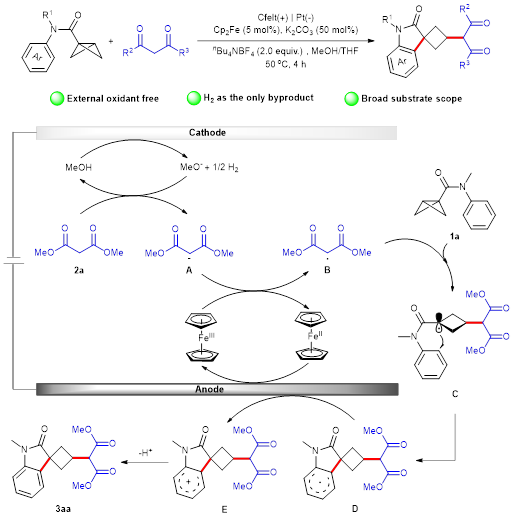 该研究开发了一种新颖的电化学释放张力策略,通过BCB酰胺与1,3-二羰基化合物的串联环化高效构建了螺环丁基吲哚酮。机理验证实验结果表明,自由基机制在该反应过程中起主导作用,反应进程涉及自由基的产生、传递及淬灭等关键步骤;循环伏安法(CV)实验通过对底物氧化还原电位的分析,证实了二茂铁催化剂与丙二酸二甲酯的共轭碱之间发生了单电子转移(SET)过程。该方法无需依赖化学计量氧化剂及贵金属催化剂,可实现直接C (sp3)-H/C (sp2)-H官能团化反应,副产物仅为氢气(H₂),且具备优异的可放大性与广泛的底物兼容性,为螺环丁基吲哚酮的绿色高效合成提供了新途径。