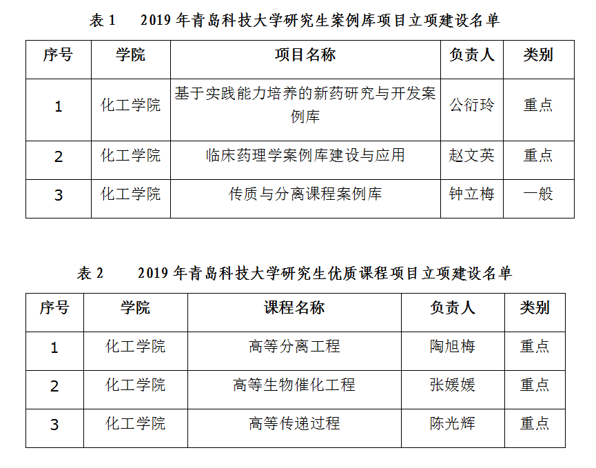 日前,2019年度青岛科技大学校级研究生教育质量提升计划立项建设项目名单正式公布,化工学院6个项目获批立项,其中研究生教学案例库3项、研究生教育优质课程3项。