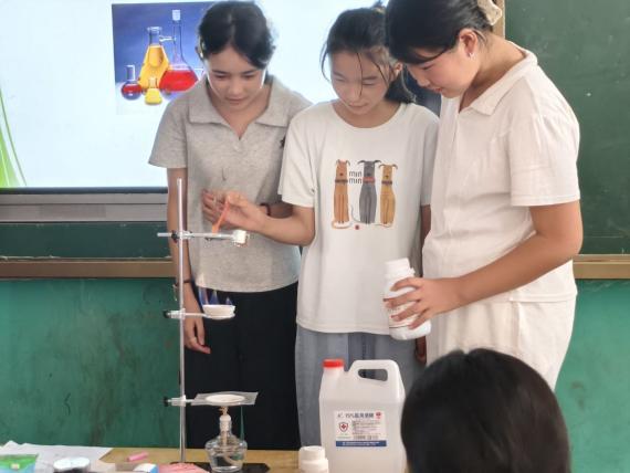 支教团依托化学工程与工艺专业优势,将实验室搬进乡村课堂。课堂伊始,“碳酸钠溶解”实验视频中,透明颗粒在水中逐渐“消失”的画面,配合志愿者“就像糖和水交朋友”的通俗讲解,瞬间拉近了孩子们与化学的距离。实操环节里,蓝色硫酸铜晶体入水后让液体幻化成“大海的颜色”,酸碱中和时“咕噜”冒泡的奇妙反应,引发阵阵欢呼。