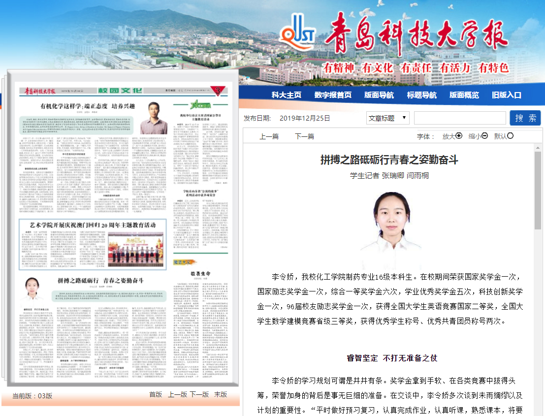 星光不负赶路人,每一次发奋努力的成果,必有加倍的赏赐!被清华保研的消息是李令娇努力了三年最好的回报,激动的同时,李令娇开始马不停蹄的规划自己未来研究生的生活。回想起当时的感受,李令娇动情的说道“高兴是肯定的,但是也有很大的压力,所以要提前预习一下将要学习的课程,阅读外文文献,提高科研能力。”李令娇将要就读生命科学学院的生物学,她准备好好学习度过硕博连读的五年,同时做化学方面的科研项目,因为学科交叉,触类旁通,将知识更好的融合起来才能实现更大价值。稳重沉静,严谨仔细是李令娇的写照。虽殊荣无数,但她从未因此停下过脚步,仍打起十二分精神向未来发起挑战。