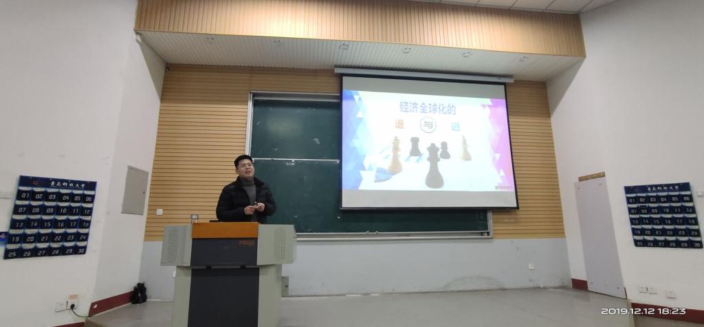 柳晓阳老师就当今世界经济全球化发展形势与同学们进行了深入的讨论。他从经济全球化的现状与形势、中美贸易保护战、中国在全球化过程中的角色以及中国应对贸易保护主义的措施等方面逐步分析,在经济全球化的今天面对国际问题没有那个国家能独善其身,各国开放合作才是解决发展问题的有效途径。