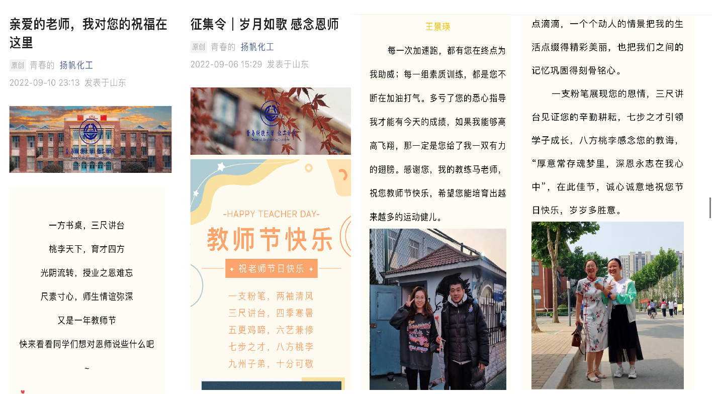 营氛围,谢师恩。学院以视频诉说师生情谊,用笔杆写下温暖祝福。学生拍摄视频表达对老师们的崇高的感谢与真挚的祝福,送上贺卡感恩老师们的辛勤付出。学院还推出教师节祝福征集活动,以多样的角度记录老师朴实无华的教诲和日夜不休的陪伴,创作出一篇篇情真意切、温暖人心的作品,将老师们的辛苦付出跃然纸上,将学生们的祝福传递给老师。